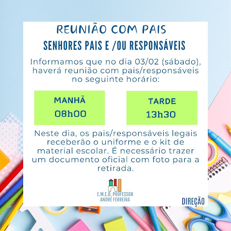 A reunião de pais será organizada em pequenos grupos no FORMATO PRESENCIAL e em quatro dias , do dia 23 a 26/02. A reunião será com o professor do educando e nesse momento acontecerá a entrega de *UNIFORMES e MATERIAL ESCOLAR *